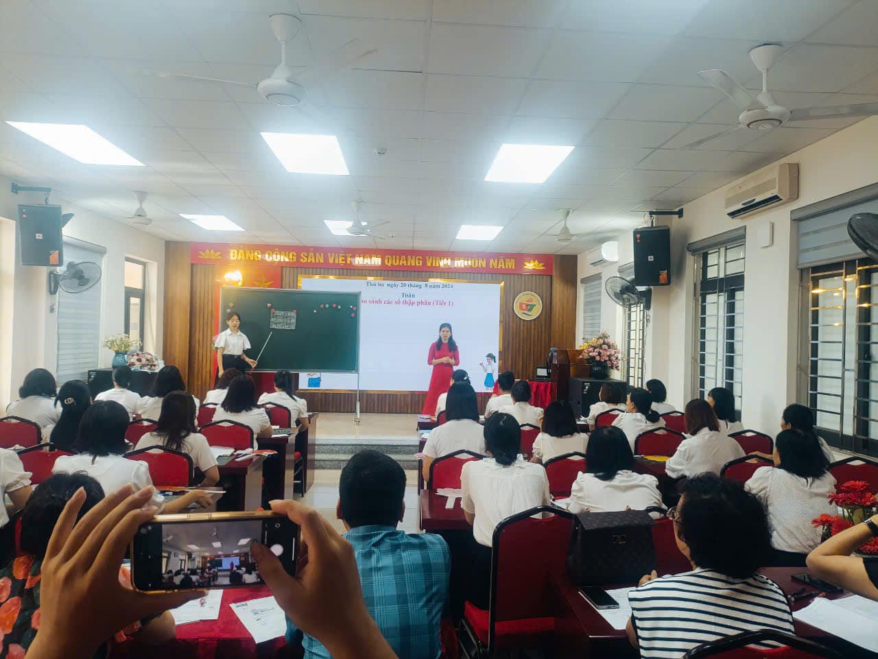 Tiết dạy minh họa đã được tập thể giáo viên khối 5 cùng anh chị em đồng nghiệp của Hội đồng sư phạm nhà trường phối hợp thực hiện. Với kĩ thuật dạy học hiện đại và khả năng vận dụng linh hoạt các phương pháp, hình thức tổ chức lớp học, cô
